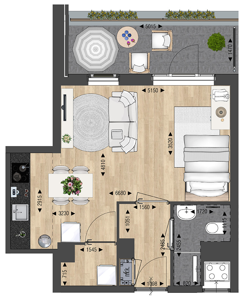 Op de zesde verdieping bevinden zich twee studio’s met privéterrassen, uitgevoerd in verschillende typen. De woonoppervlakte varieert van 30 tot 35 m², met elk een privédakterras van circa 7 m², ideaal om buiten te ontspannen. Deze studio is zeer geschikt voor een single starter.